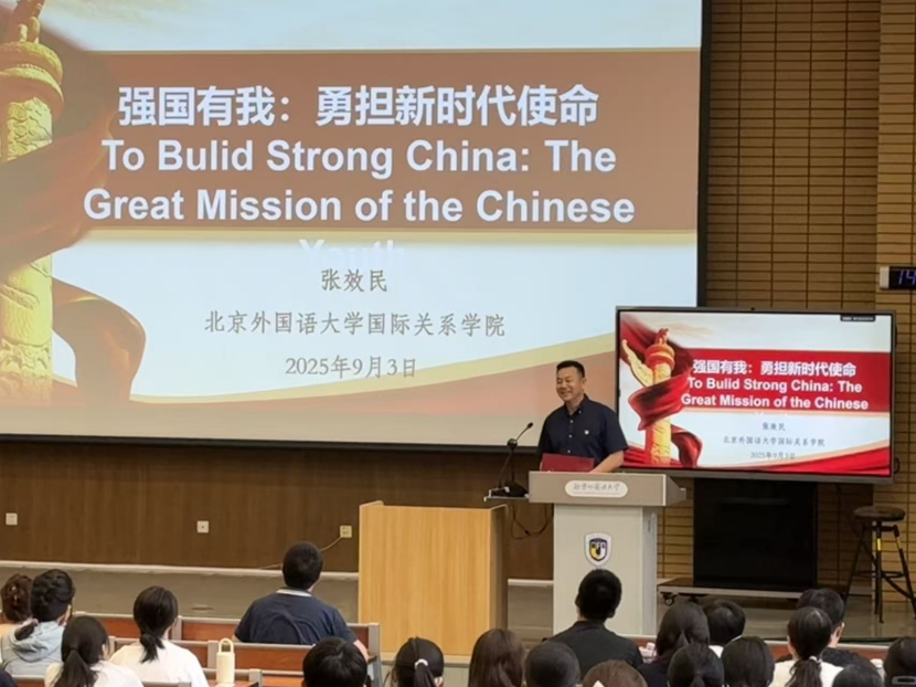 张效民书记首先结合上午观看的“纪念中国人民抗日战争暨世界反法西斯战争胜利80周年阅兵式”,与新生们分享了自己的感受。他表示,庄严宏大的阅兵式彰显了今日和平来之不易,为祖国的强大倍感骄傲和自豪。随后,他以“强国有我:勇担新时代使命”为主题,用中英双语为新生们带来了一堂深刻的“开学第一课”。