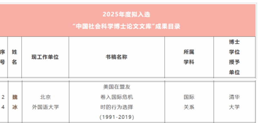 近期,我院青年教师杨双梅、夏方波申报的项目“东南亚政党政治‘家族化’与家族政治‘政党化’的逻辑、影响及中国对策研究”等两项课题喜获国家社科基金青年项目立项。青年教师魏冰的博士论文《美国在盟友卷入国际危机时的行为选择(1991-2019)》成功入选中国社会科学出版社2025年度“中国社会科学博士论文文库”,来自全国高校、研究院所的102部博士论文参评,最终评选出31部拟入选2025年度“中国社会科学博士论文文库”。青年教师贾力楠的《从比较历史政治视角反思民主和平论》和释启鹏副教授的《“众”不敌“寡”:自由主义民主缘何必然衰退》刊载在2025年第4期的《政治学研究》上。这是我院历史上首次两位教师在《政治学研究》同一期发表论文,充分展现出近年来bbin宝盈在推进政治学学科发展、助力青年学者成长成才方面取得的重大成绩。《政治学研究》是中国社会科学院政治学研究所主办的学术期刊,入选CSSCI核心期和AMI顶级期刊,复合影响因子8.494,是政治学领域最具权威性的刊物。