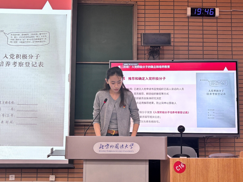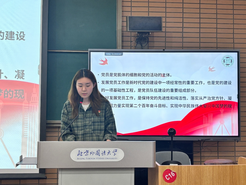 会上,张顾子煊首先向新生介绍国际关系学党支部基本架构及各支部的基本情况。她以《中国共产党发展党员工作细则》为基础,详细介绍了入党的基本条件,培养联系人、入党介绍人的主要任务,党员义务等,梳理了党员发展的重要节点,侧重讲解了入党申请书的递交和入党申请人谈话流程。