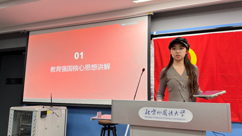 随后,张顾子煊同志围绕全国教育大会的重要意义和大会精神展开讲解,分析了当前教育发展内外部环境面临的五大深刻变化,指出广大师生应主动扛起教育强国建设的使命责任。她强调,大学生思想政治课对国家发展和个人成长都具有重要意义,青年学生应将思政课学习与社会实践相结合,让生活成为思政教育的第二课堂。在培养外交人才方面,她鼓励同学们积极发挥青年在二轨外交中的作用,讲好中国故事,增进国际理解、消除误解,展现新时代青年的责任与担当。她号召同学们依托北外的语言教学优势和学院丰富的平台资源,在大学四年中不断提升自身外交素养和沟通能力,在大国外交舞台上贡献青春力量。