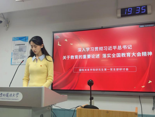 会议伊始,王羽佳同志带领大家回顾学习以“扎实推动教育强国建设”为主题的北京外国语大学师生党员集中培训课程内容。她强调,我们需要进一步深入学习领会习近平总书记关于教育的重要论述,深刻理解中国式现代化建设和教育强国的内在关系,牢牢把握教育的政治属性、人民属性、战略属性。